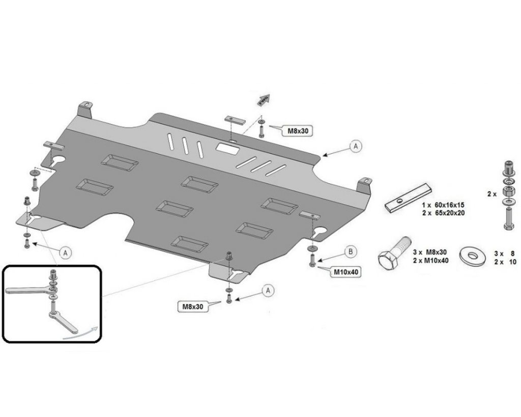 Montering sker enkelt i original fästpunkter utan åverkan på din bil. Hasplåten finns tillgänglig i stål som svartlackerats.