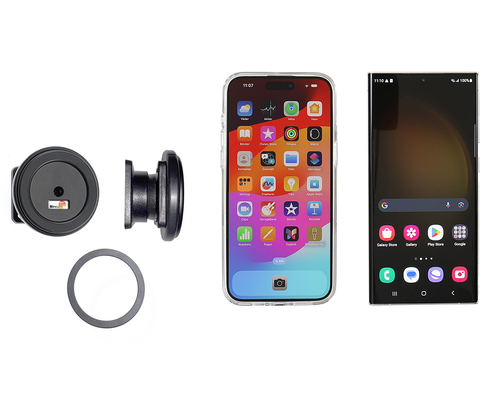 Med en mobilhållare med Magsafe för bil får du en säker och bekväm placering av telefonen under körning. Hållaren är utrustad med starka magneter som håller mobilen stadigt på plats och är kompatibel med MagSafe-enheter. För telefoner som inte har stöd för Magsafe medföljer en metallring som enkelt fästs med tejp för att ge samma stabila funktion. Den här Brodit hållaren är utvecklad för att ge enkel åtkomst till mobilen och gör det lätt att använda navigation, samtal och andra funktioner på ett tryggt sätt i bilen. Produkten är tillverkad i svart ABS/Acetal-plast av hög kvalitet och har en stilren design som smälter väl in i bilens interiör.