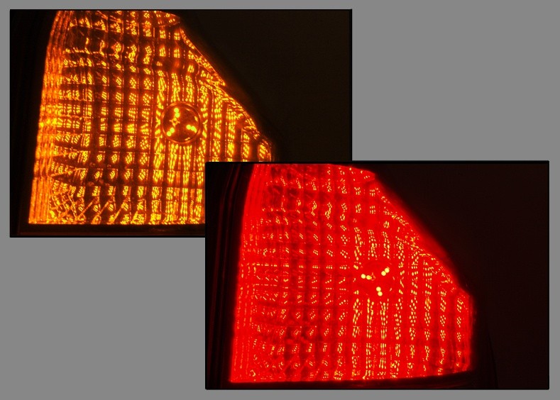 Lampan lyser med fast rött sken, och när blinkersen går igång kommer det vita ljuset att slocka, samtidigt som de gula/orange dioderna börjar blinka.