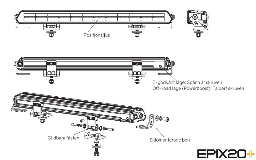 Den dynamiska upptändningen av positionsljuset ger dessutom rampen en effektfull uppstart. Allt du behöver och vill ha i en LED-ramp, hittar du hos Epix+. Vi har maximerat prestandan i E-godkänt läge, med möjlighet till Powerboost när du vill gå ”off road”. Egenutvecklade smarta fästen säkerställer en montering i stort sett var och hur du vill på fordonet.
