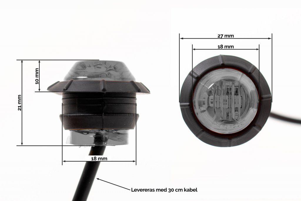 Diametern för lampan är 18 mm (inkl. gummi: 27 mm) och vid infällnad bygger den 10 mm. Levereras med 30 cm kabel. Passar både till 12 och 24 volts system.