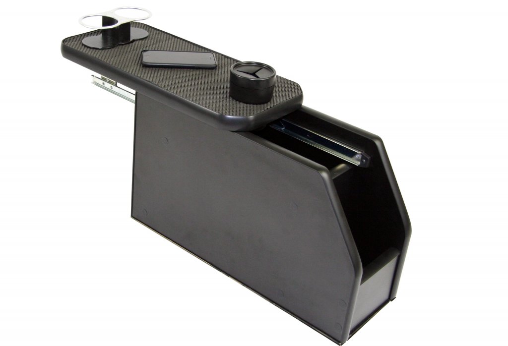 Toppskivan är monterad med dubbla teleskopskenor för att enkelt kunna skjutas bakåt. Inne i konsolen hittar du ett stort förvaringsfack tillsammans med ett mindre riktat mot instrumentpanelen, vilket enkelt nås när locket är stängd. Levereras med antiglidmatta och dubbla uttag för t.ex drickaburkar eller förvaringshållare i toppskivan.