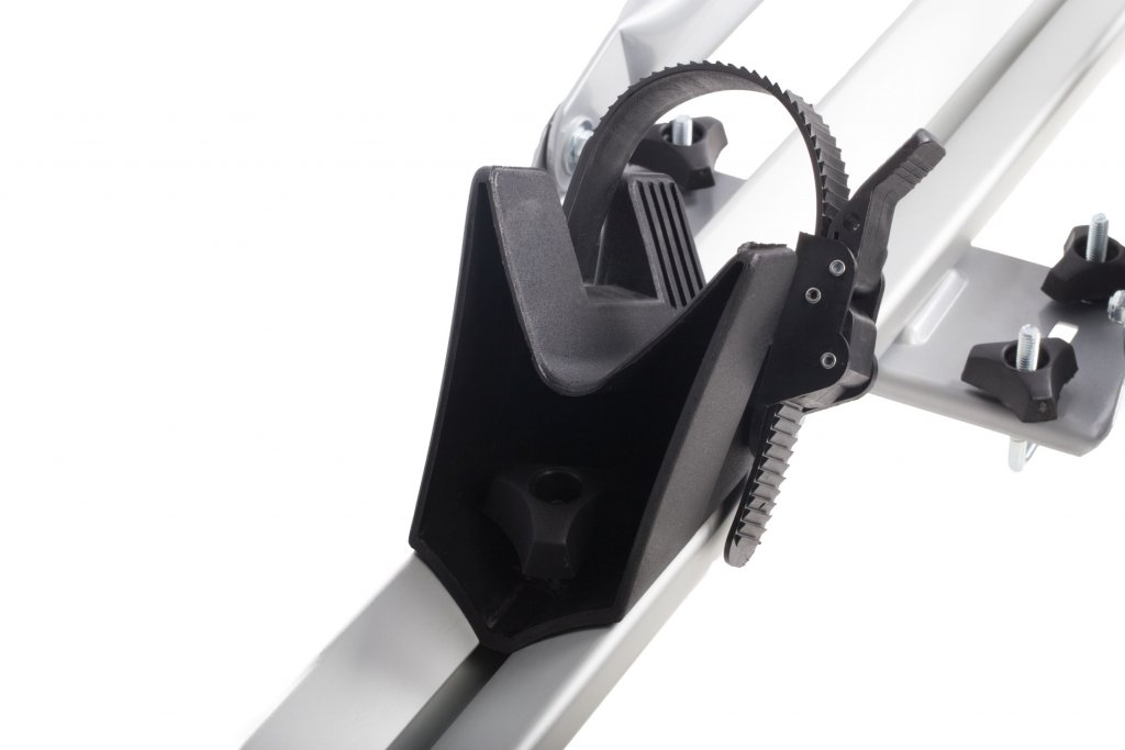 Aluminiumskenan för hjulfastsättning ger dig möjliget att förflytta cykeln framåt och bakåt för optimal lastning. Låsarmen i mitten är justerbar i vinkel för att optimalt nå ramen och förenkla fastsättningen av cykeln.
