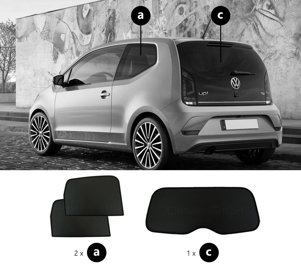 Solskydd Volkswagen Up levereras som komplett sats för bakdörrarna och bagageluckan.