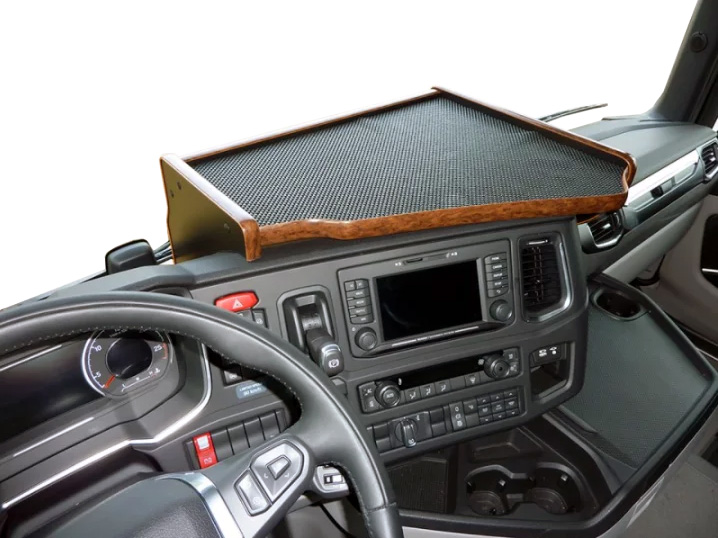 Praktiskt lastbilsbord för montering på instrumentpanelen, snett framför förarplatsen i Scania R- & S-serien (Next Gen) från 2017- och framåt.