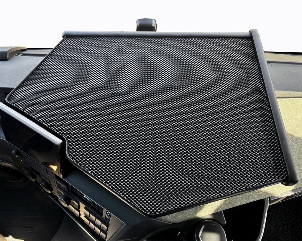 Bord Volvo FH5 från 2021- och framåt ger din lastbil extra funktionalitet! Detta praktiska och stilrena avlastningsbord är designat för att monteras på instrumentpanelen snett framför förarplatsen. Perfekt för att skapa en stabil arbetsyta eller för att hålla telefon, anteckningar och andra föremål säkra under färden.