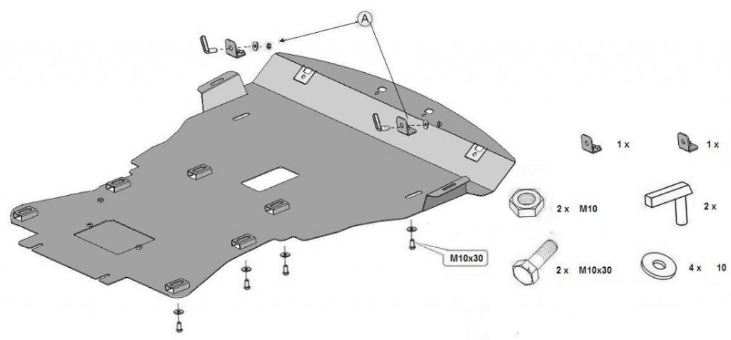 Hasplåt framtagen för att skydda motor från skador. Plåten är utrustad med servicelucka för enkelt oljebyte.