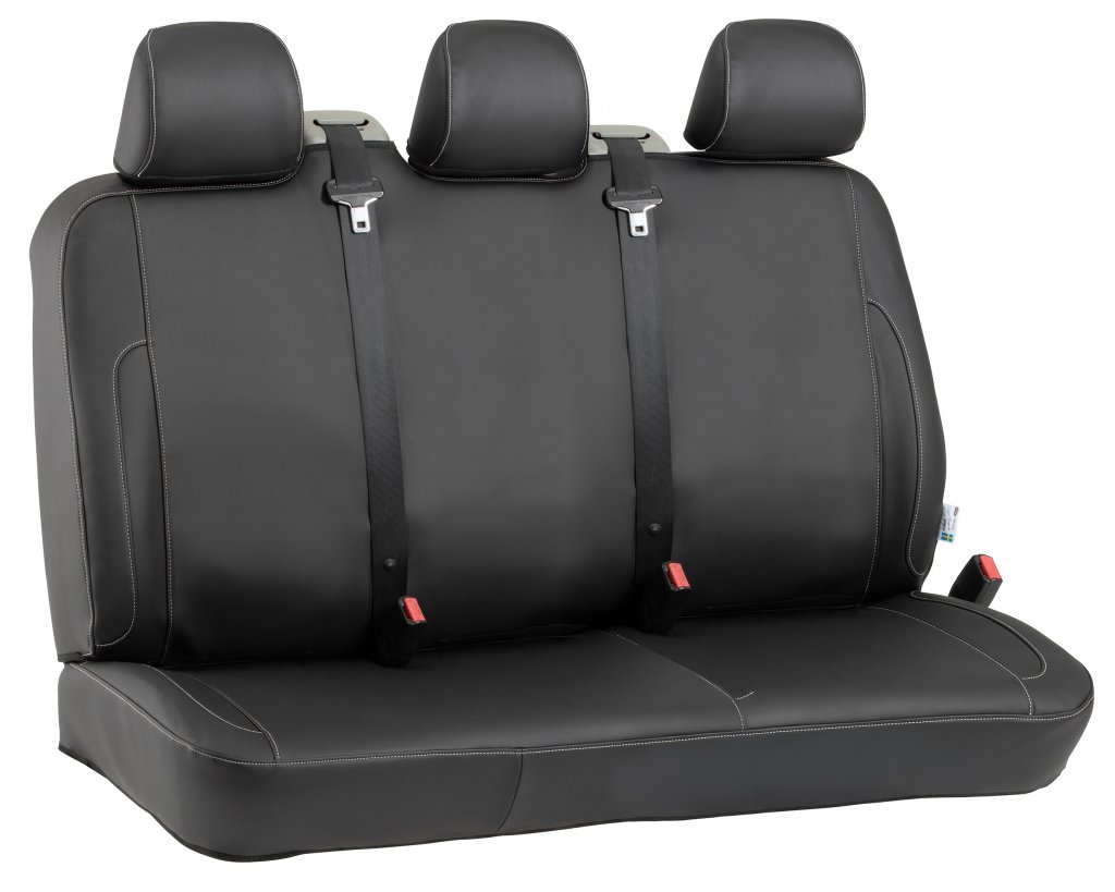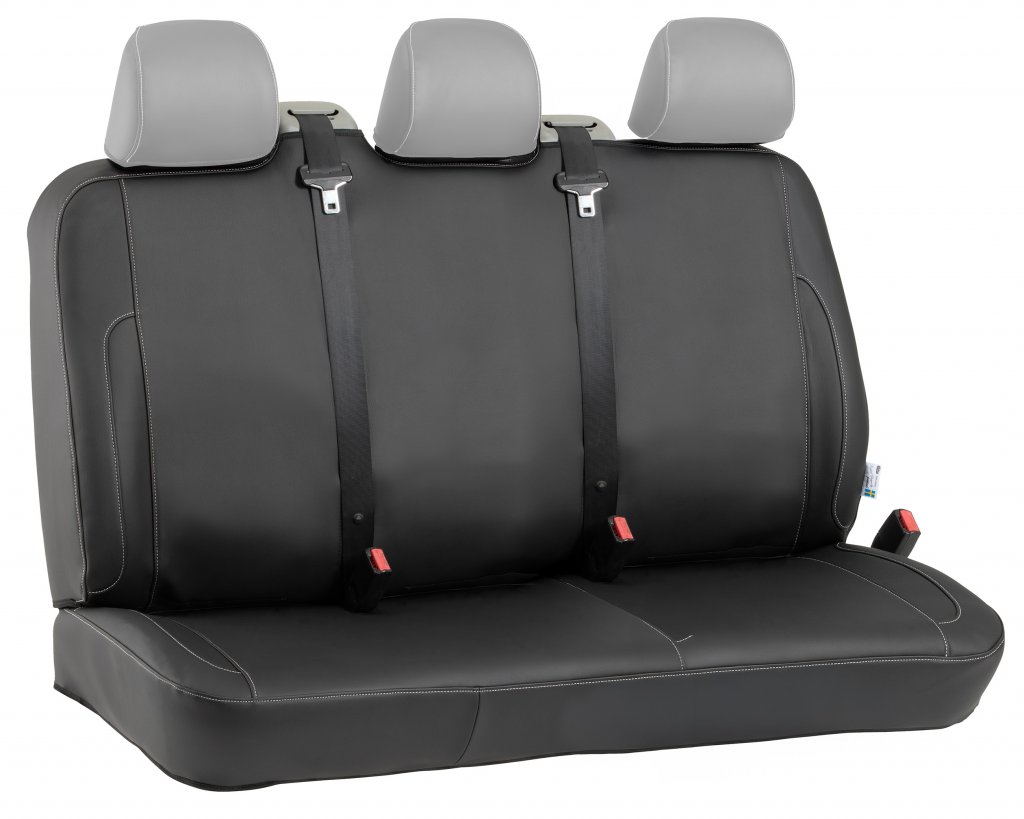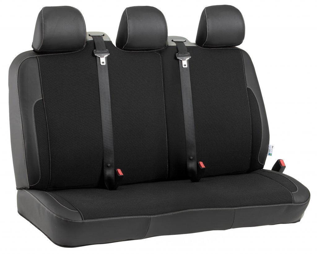 - Vinyl och tyg har en design med dekorsömmar i silver. Dekorsömmarna ger extra hållfasthet och är tillsammans med tygets höga slitstyrka perfekt för yrkesbilar. Sittytorna har ett vävt tyg kombinerat med mattsvart konstläder på sidorna.