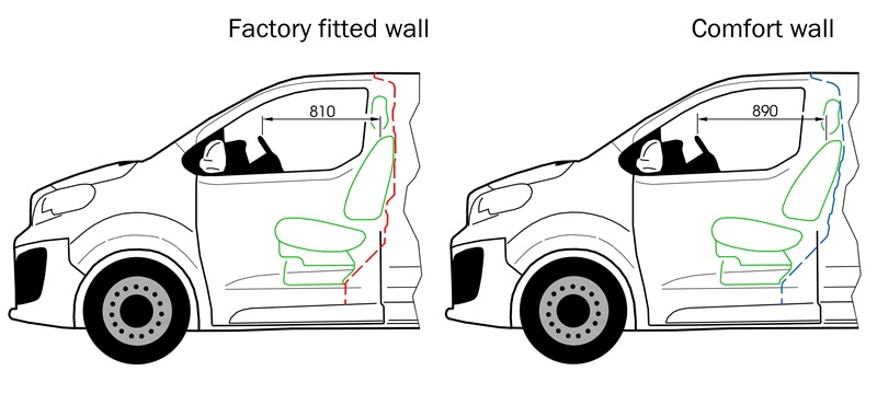 - Bättre körställning – Komfortväggen är 80 mm djupare än originalväggen, vilket ger extra utrymme för förare och passagerare.