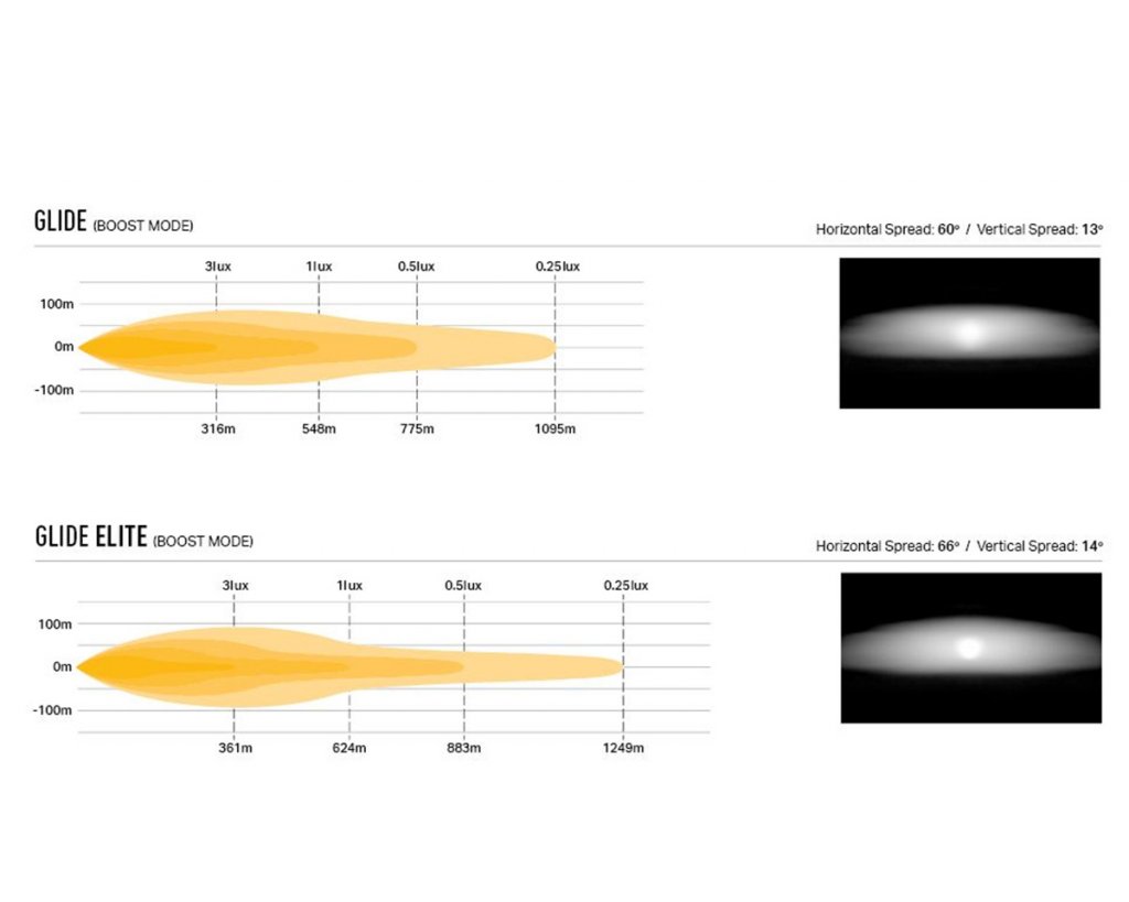 | Räckvidd (0,25 lux) | 1095 meter | 1095 meter | 1249 meter | 1249 meter |