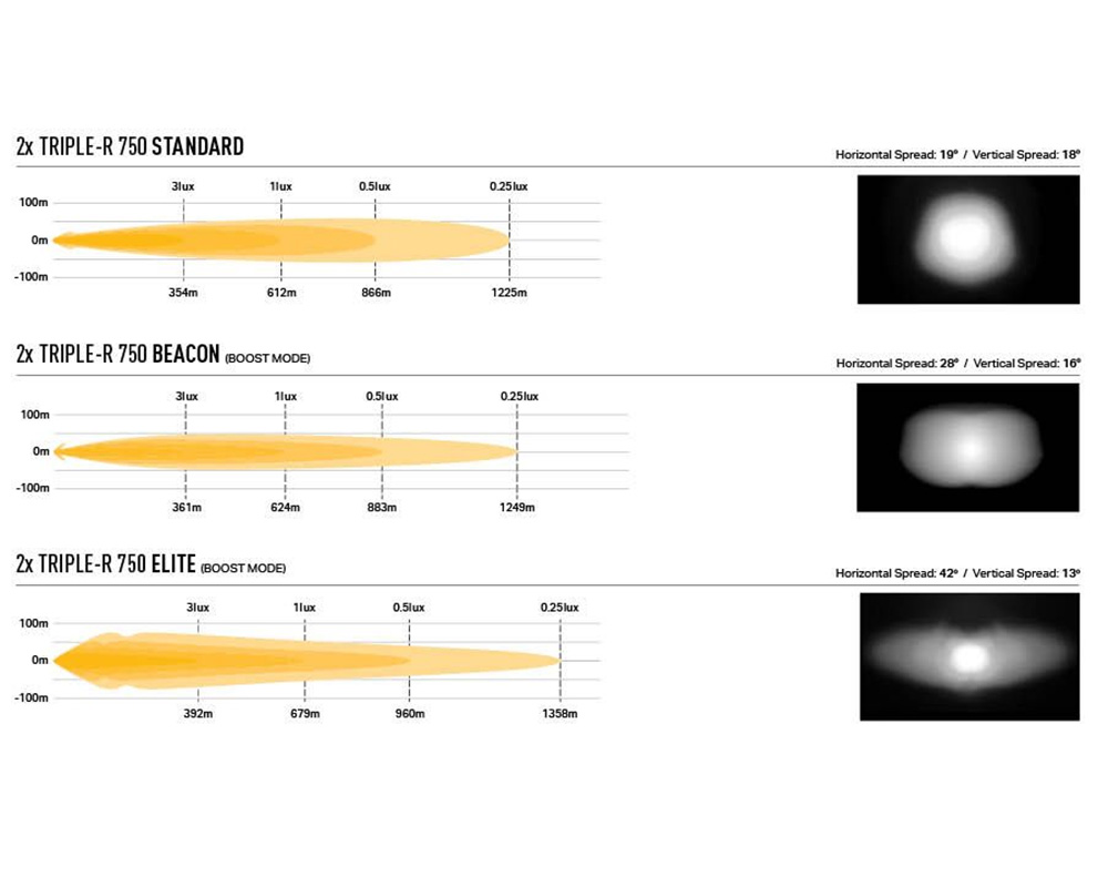 | Räckvidd (0,25 lux) | 1225 meter | 1358 meter |