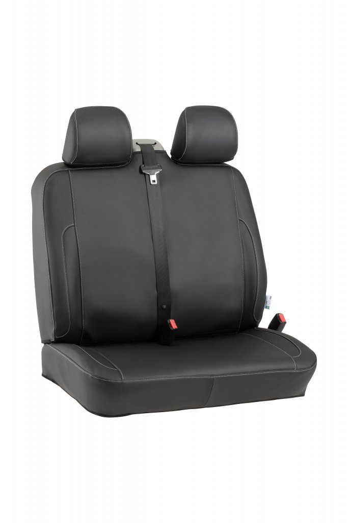- Vinyl och tyg har en design med dekorsömmar i silver. Dekorsömmarna ger extra hållfasthet och är tillsammans med tygets höga slitstyrka perfekt för yrkesbilar. Sittytorna har ett vävt tyg kombinerat med mattsvart konstläder på sidorna.