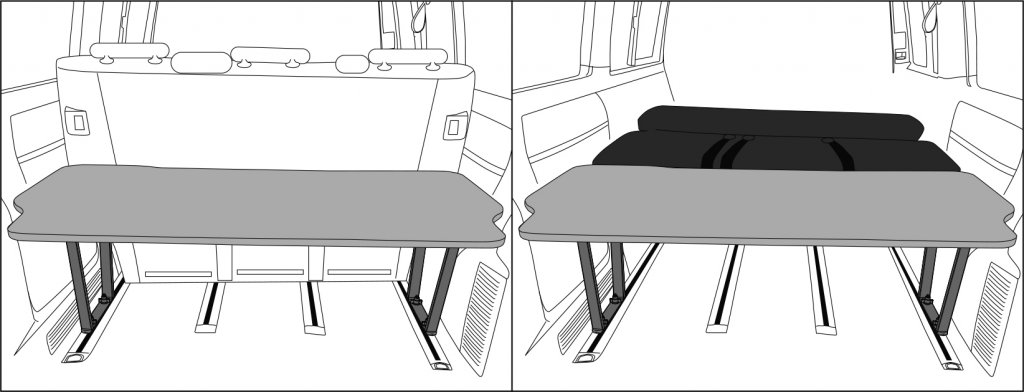 En av de främsta fördelarna med denna bagagehylla är dess flexibilitet. När den 3-sitsiga soffan fälls ner hamnar hyllans yta i perfekt nivå med soffans ryggstöd. Denna smarta design skapar en stor, helt plan yta i din Mercedes Vito, vilket är idealiskt för att lägga ut en madrass. Nu kan du förvandla din bil till en bekväm sovplats, redo för spontana utflykter och campingäventyr.