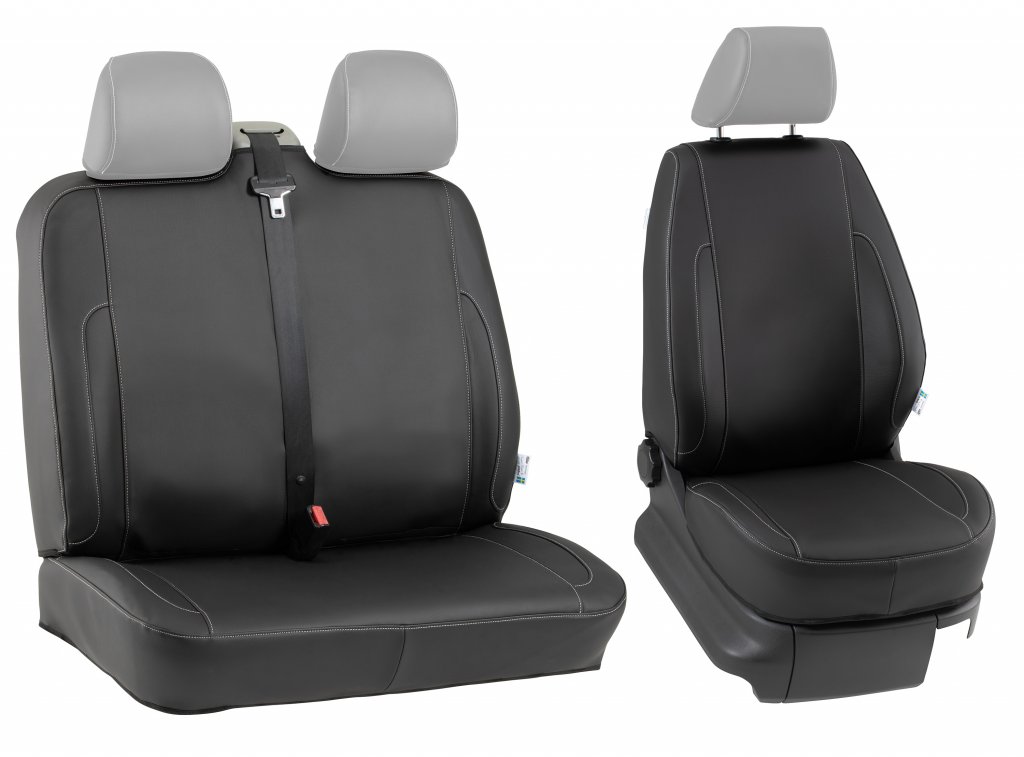 - Vinyl och tyg har en design med dekorsömmar i silver. Dekorsömmarna ger extra hållfasthet och är tillsammans med tygets höga slitstyrka perfekt för yrkesbilar. Sittytorna har ett vävt tyg kombinerat med mattsvart konstläder på sidorna.