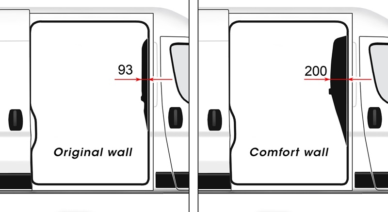 - Bättre körställning – Komfortväggen är 107 mm djupare än originalväggen, vilket ger extra utrymme för förare och passagerare.