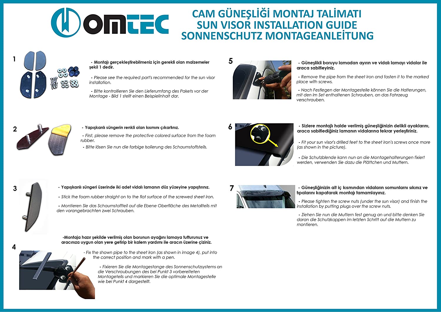 - Monteringen av solskydd Opel Vivaro sker med tillhörande monteringssats. Monteringsdetaljerna i pulverlackerad stål skruvas fast i bilens A-stolpar för en stabil montering. Därefter monteras solskyddet plastdel i monteringsdetaljerna med bult, brickor och muttrar, och avslutas med en högblank svart täckkåpa i samma material som solskyddet för att täcka skruvarna.