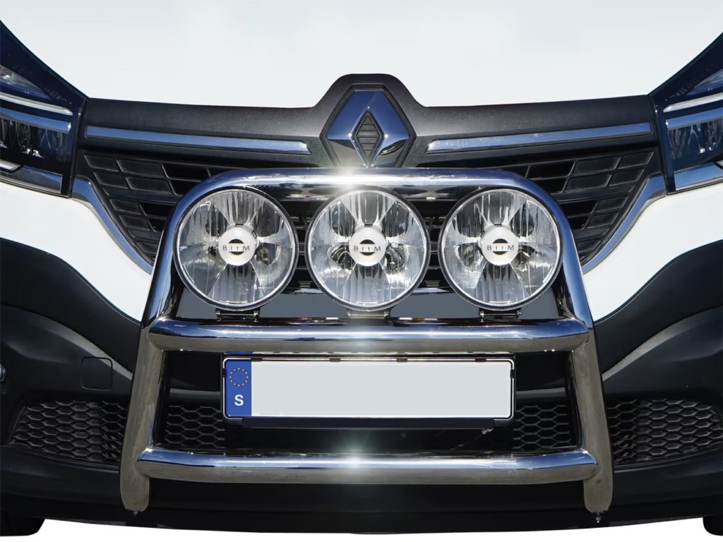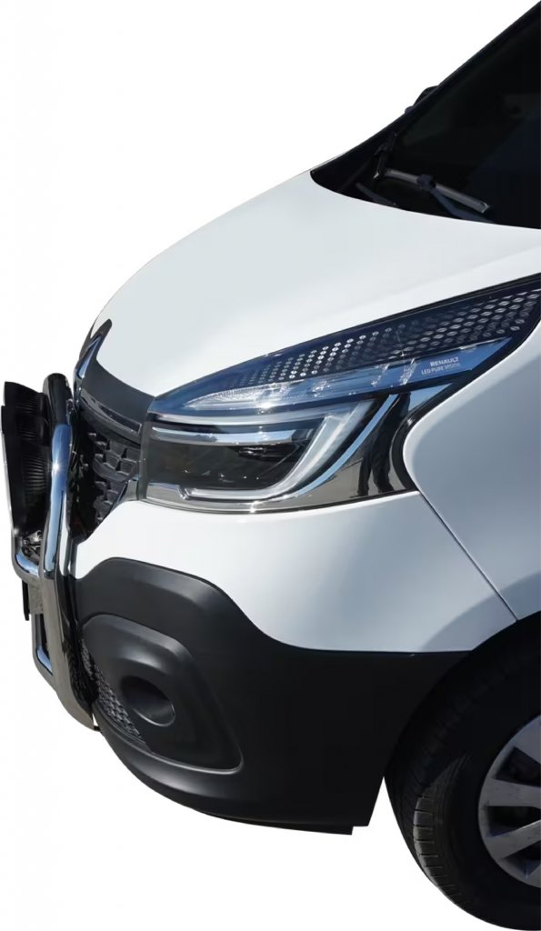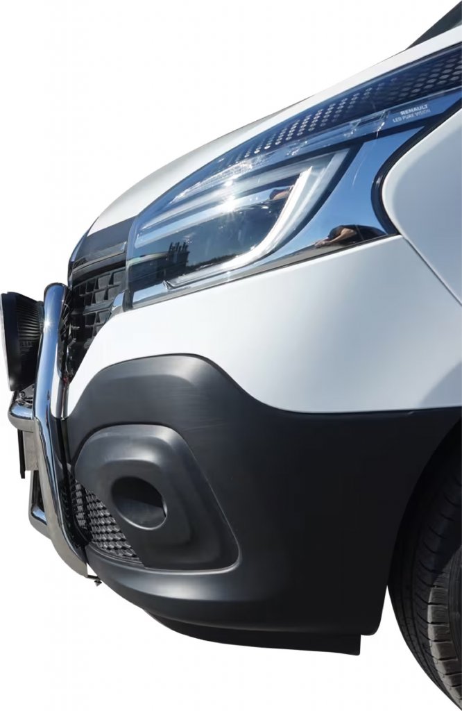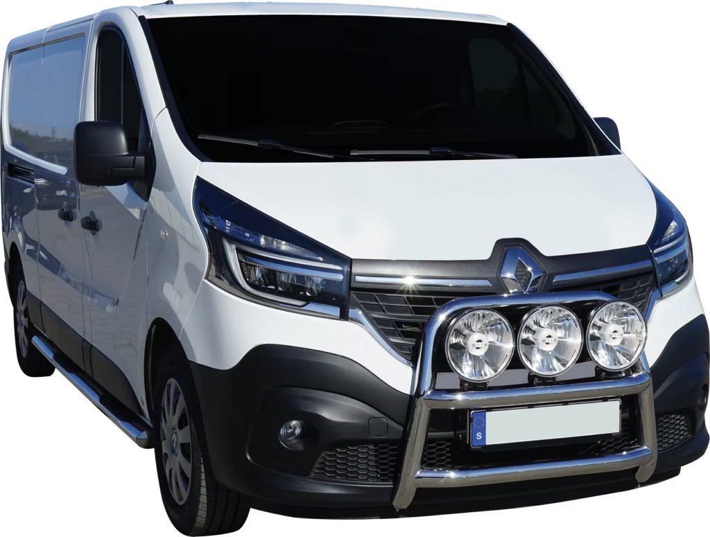 Denna frontbåge är specifikt framtagen för Renault Trafic, vilket garanterar en tajt och snygg montering som följer bilens naturliga linjer. Den diskreta men kraftfulla designen smälter perfekt samman med bilens exteriör utan att ge ett överdimensionerat intryck. Under det horisontella tvärröret finns ett integrerat fäste för registreringsskyltshållare, vilket gör monteringen enkel och smidig utan att kompromissa med designen.