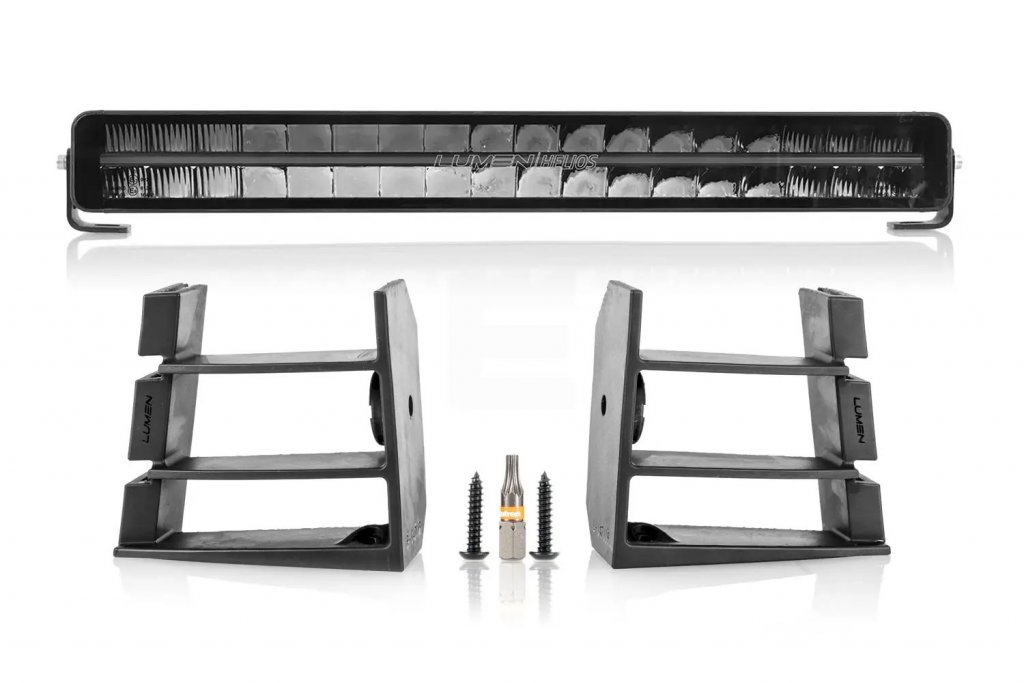 I detta paket medföljer modellanpassade fästen för grillen samt en Lumen Helios DX20 LED-ramp. För en komplett installation behöver du komplettera med en passande reläsats och eventuellt en styrströmsgivare.
