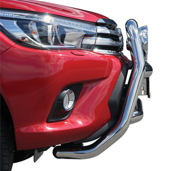 Frontbågen har plats för tre fullstora extraljus (235 mm). Fästpunkterna för extraljusen är infällda i frontbågens rör och låter dig justera djupet. Bågen tillsammans med extraljus ger din Hilux ett ordentligt helljus, och ett grymt intryck framifrån!