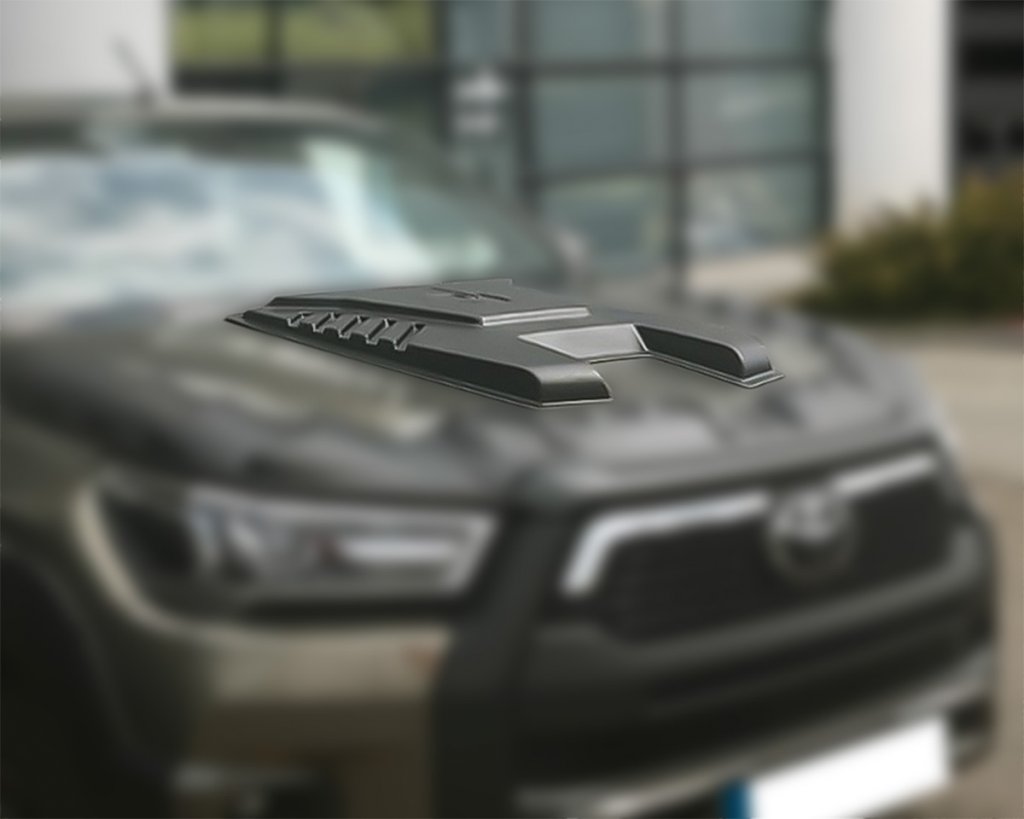 Huvscoop Toyota Hilux från 2021- och framåt är modellanpassat för perfekt passform och scoopet ger din bil ett riktigt kaxigt utseende. Monteras mycket enkelt med dubbelhäftande tejp.