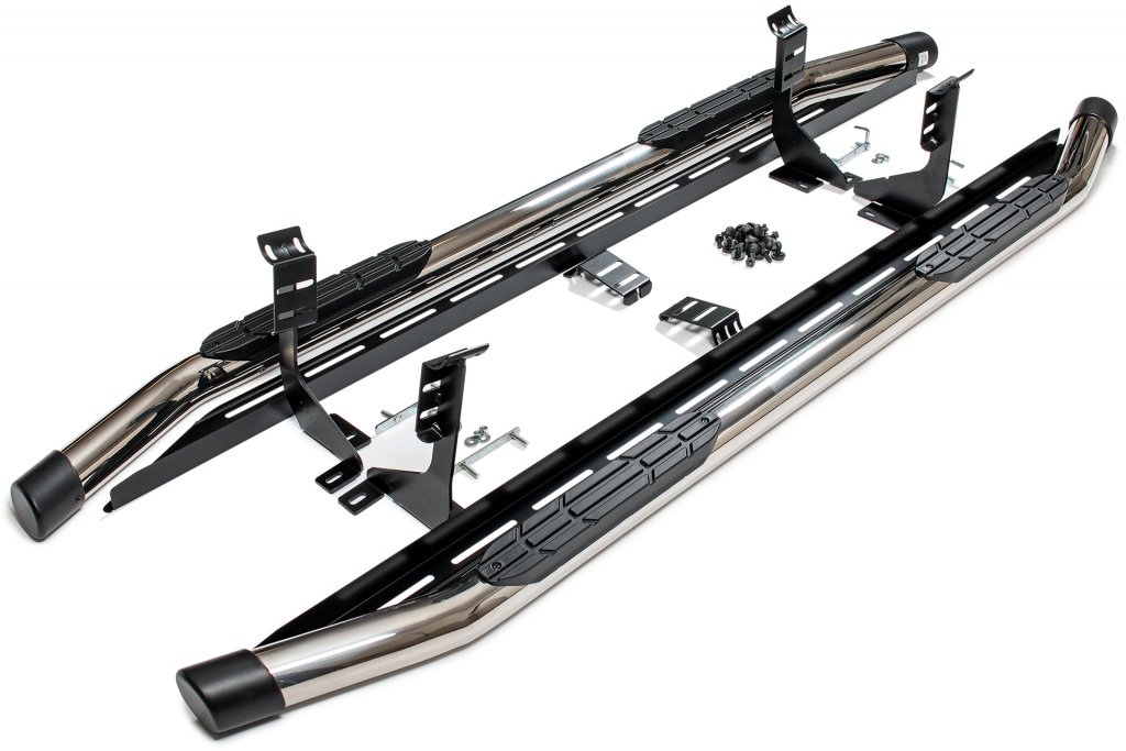 Sidorör med stegytor till Volkswagen Amarok från 2011-2020. Sidorören är tillverkade i högglanspolerat rostfritt stål med slätslipade svetsskarvar. De ovala stegytorna är av svart plast.
