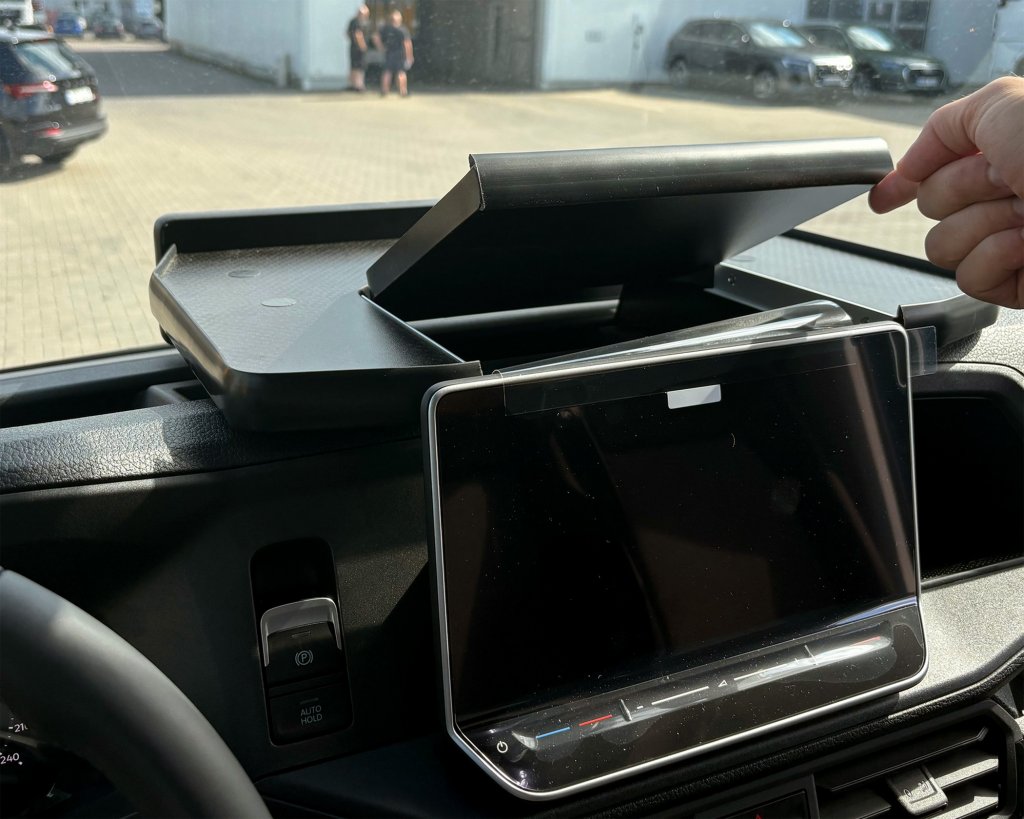 Detta bord är specialdesignat för att passa perfekt i din Volkswagen Crafter och ger dig en praktisk avlastningsyta för en mer organiserad instrumentpanel. Den medföljande antiglidmattan ser till att dina saker ligger säkert på plats under färden. För bilar med öppet fack på instrumentpanelen är bordet utrustat med en öppningsbar lucka, vilket ger enkel åtkomst till utrymmet under bordet.