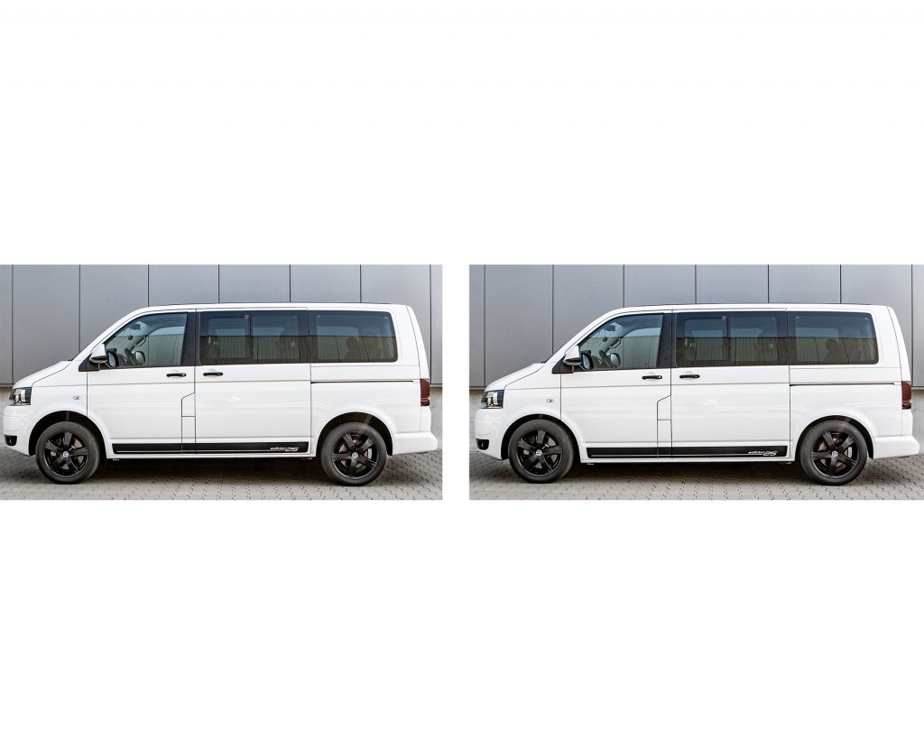 Coilover (ställbart chassi) från H&R är modellspecifikt avpassat för VW Transporter. Ger väldigt fina och responsiva vägegenskaper utan att kännas "stötigt". Bilen kan med enkla ingrepp sänkas eller höjas inom angivet spann.
